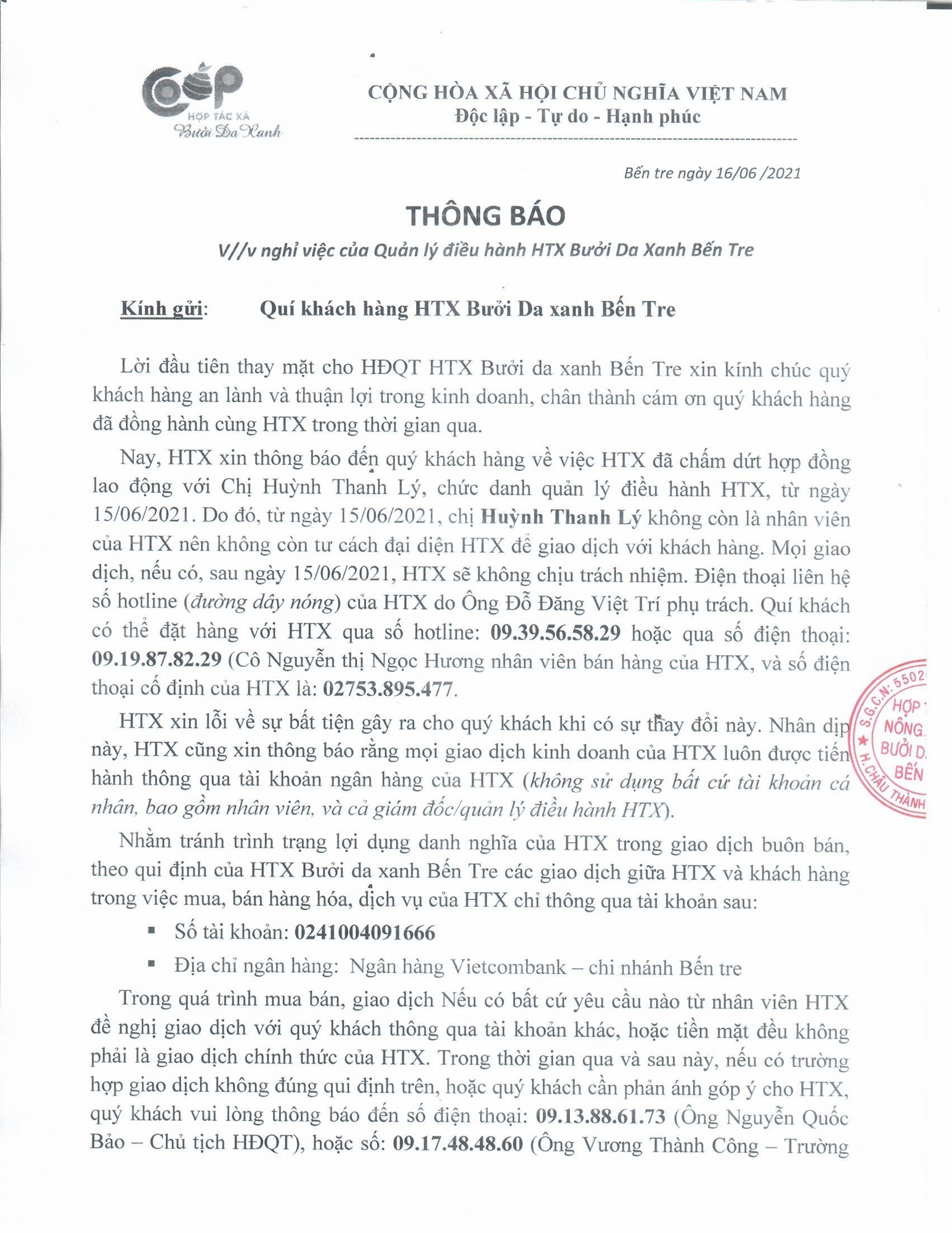 Nay HTX xin thông báo về việc chấm dứt hợp đồng lao động với chị Huỳnh Thanh Lý, chức danh: Quản lý điều hành từ ngày 15/06/2021. Do đó, sau ngày 15/6/21 mọi giao dịch giữa chị Huỳnh Thanh Lý với khách hàng (nếu có), HTX sẽ không chịu trách nhiệm.