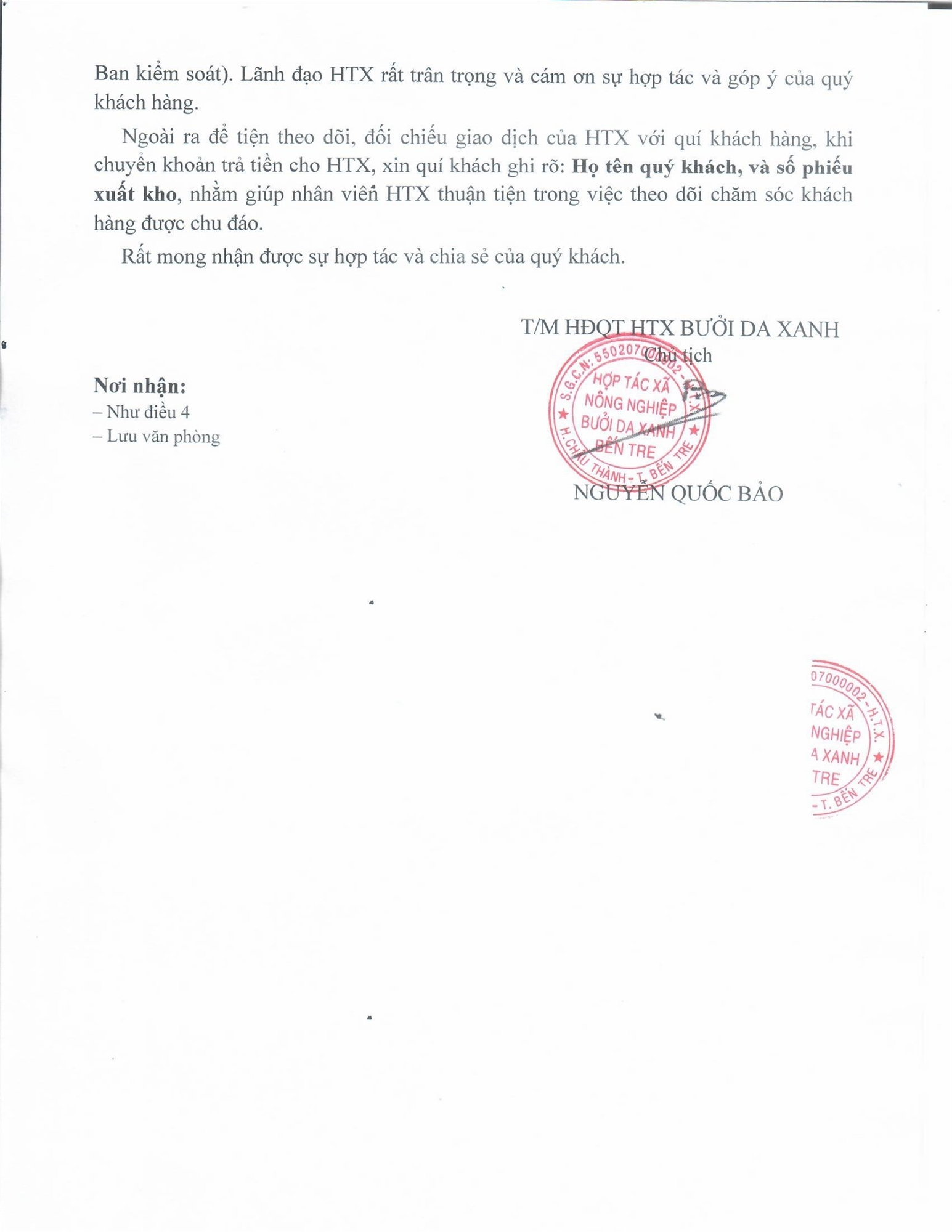 Ngoài ra, để tiện theo dõi, đối chiếu giao dịch của HTX với quý khách hàng, khi chuyển khoản cho HTX, xin quý khách vui lòng ghi rõ: Họ tên quý khách và số phiếu xuất kho, ngày xuất kho.